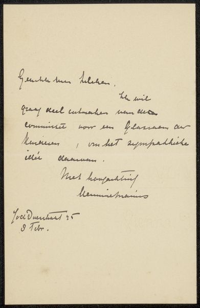 Curator: Welcome. Before us we have “Brief aan Philip Zilcken,” a letter from artist Grada Hermina Marius to critic Philip Zilcken, likely crafted before 1919. The work is composed in ink on paper. Editor: Wow, that script just sings on the page! It looks almost like musical notation, a little whirlwind of handwritten intimacy captured forever. It has the appeal of looking over an artist’s shoulder as they are deep in thought. Curator: Absolutely. This letter provides insight into the social dynamics within the art world. Zilcken, a respected critic, held significant sway. We can imagine Marius carefully considering her words, balancing professional respect with personal expression. Editor: Right, but doesn’t it also hint at the vulnerability of the creative process? Imagine pouring your heart into your work, then sending it off hoping it will be well received by somebody as powerful as a critic. The simple act of committing the words to paper somehow captures that vulnerability. Curator: That's a valid perspective, but I'm drawn to the material culture of this artifact. The specific ink used, the paper texture – each tells a silent story about artistic practices. Furthermore, it underscores the essential nature of artistic dialogues occurring in the late 19th and early 20th century Netherlands. Editor: It's a beautiful little portal into the artist’s mindset. Curator: It invites us to look at those relationships critically, seeing beyond sentiment to the systems in which artists navigated to advance their work. Thank you for sharing that personal view. Editor: My pleasure, history can often be found in these types of places: a seemingly insignificant letter that captures an emotional truth about the relationship between the critic and the artist.