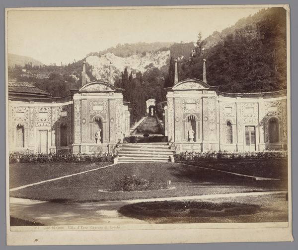 Curator: What a beautifully composed image! This photograph, taken by Étienne Neurdein, presents the Muziekkiosk bij het Monte Carlo Casino, placing us somewhere between 1870 and 1900. Editor: There’s a strange stillness to it, isn’t there? Despite all that potential activity in the bandstand, it feels so isolated, almost sterile. Curator: Well, think of the context. Monte Carlo at this time was the playground for Europe’s elite. The Casino itself, a symbol of both extravagant wealth and, arguably, moral decay. Neurdein likely aimed to capture a moment of ordered beauty, masking some of the social realities behind the veneer. Editor: Exactly! The kiosque isn’t just a place for music. It represents a stage, not only for performances but also for societal hierarchies. Who was permitted to gather there? Who was excluded? And, importantly, whose leisure was subsidized by the exploitation of others? Curator: The very structure suggests that. The ornate ironwork, almost cage-like, frames the musicians but also contains them. The gaze is always directed. There are always spectators, implicitly endorsing the whole social system. Editor: It speaks volumes, doesn’t it? This image functions as both a depiction of aesthetic beauty and an emblem of social disparity. The quiet composition barely conceals the social tensions bubbling beneath. Curator: Indeed. Looking closely, one could ask whose narrative does Neurdein's lens promote? Was this capturing a carefully orchestrated performance of the belle epoque, consciously ignoring other socio-political currents? Editor: The history of photography, in general, isn't only technical or artistic. Considering the subjects photographers choose, the vision and politics intertwined within the choice, enriches and problematizes interpretations such as Neurdein's photograph of this musical stage. Curator: Agreed. Considering that it’s far more than just architecture documentation enables critical thinking about both history and current issues of equality. Editor: Precisely. By acknowledging its contradictions, its beauty and underlying social currents, we can actively understand our historical image archives with an enriching historical framework.