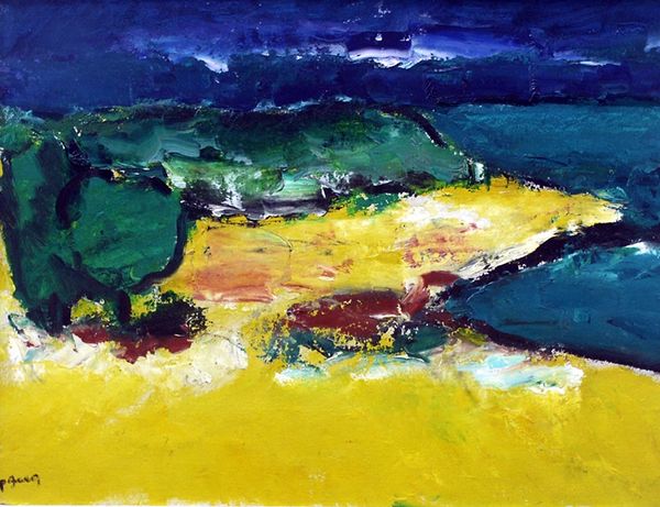 Ion Pacea painted this oil on cardboard titled 'Marina'. Born in Romania, Pacea lived through the rise and fall of communism in Eastern Europe. We might consider how his bright, almost fauvist color palette served as a visual escape during a period of political oppression, where free expression was often stifled. 'Marina' radiates with emotive color, but think about the emotional undertones during this period. Does the painting depict a space of freedom, or does it hint at the unobtainable? Perhaps the vivid hues speak to a longing for openness. Pacea himself once said, "Color is life, it is joy." As you reflect on 'Marina,' think about how Pacea uses color to mediate his own experience of his socio-political context.