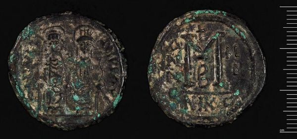 Curator: It's incredible how much history is embedded within this small object. This is a coin, dating back to the time of Gordian III. Editor: There is something incredibly poignant about the patina of age on this coin. It almost feels like a fossil. Curator: The coin's materiality speaks volumes; its metallic composition facilitated not just trade but also the tangible projection of imperial power and ideology. The labor invested in minting such objects circulated symbolic value, reinforcing hierarchies. Editor: And it’s fascinating to consider this coin as a form of propaganda, especially in the context of Roman imperial power. Whose faces got to be immortalized? What messages were they trying to send? Curator: Precisely! These coins serve as a window into the economic and political systems that shaped ancient societies. Editor: Seeing this coin makes me think about the legacy of Roman rule and its impact on contemporary notions of power, representation, and value. Thank you! Curator: Indeed, examining this coin through multiple lenses allows us to appreciate its historical weight, both literally and figuratively.