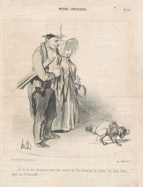 Curator: Look at this lithograph, "Sans doute M. Riflot le droit...", created in 1839 by Honoré Daumier. It's a fascinating glimpse into 19th-century French society. Editor: My immediate reaction is… cynical humor. The elongated faces and almost grotesque features are striking, almost confrontational. I’m also intrigued by the dynamic hatching; look how it defines volume and texture. Curator: Precisely! Daumier was a master of social commentary. This piece, part of his series "La journée du célibataire," is a commentary on bachelorhood. Consider the sociopolitical backdrop: the July Monarchy was rife with debates on societal roles and class structures. Daumier used caricature to critique the bourgeoisie and their values. Editor: I notice that. The exaggeration creates distance; we are meant to observe critically, not empathize. The three men are similarly dressed, yet each is distinctly grotesque, united in… unpleasantness. Look at their strange interaction—what do you read there? Curator: The title itself is key; “Doubtless, Mr. Riflot, the right of petition is sacred...” is what's inscribed under the image. He's satirizing the discussions around petitions and the rights of unmarried men, painting them as almost parodic figures within society. They're holding some kind of decree or document. What power that conferred, in that setting, it’s hard to see, judging from Daumier’s interpretation. Editor: And beneath them are two stray dogs, looking emaciated. Interesting that he places them there, at a kind of lower level in the image; it amplifies the cynical air. One sees such clear manipulation of line and form in these prints; Daumier creates not only satire, but such clear hierarchy with formal methods! Curator: Absolutely, he cleverly uses art as a mirror, reflecting society's own biases and prejudices. It really captures the undercurrents of social tensions present at the time. Editor: Looking at this again, the balance between social criticism and formal elegance is incredible. Thank you.