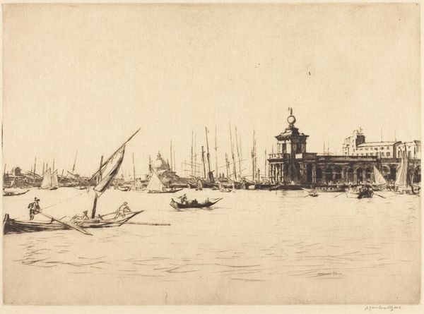 Editor: We're looking at "Dogana, Venice," a pencil sketch by Muirhead Bone. There's a hazy quality to it, almost like looking at a memory. What strikes me is the sheer number of boats and masts—a dense, working harbor. What do you see in this piece? Curator: I see a document of labor. The sketch focuses on the infrastructure and the tools of commerce, really. It's not a romantic view of Venice; it's about the practical reality of a port city. The Dogana, the customs house itself, dominates the composition. Editor: So, the drawing isn't just about aesthetics, it's about showing the materials, the hard work that went into making Venice what it was. Curator: Precisely. Consider the medium: pencil. A readily available tool for documenting the scene directly. How does that accessibility inform your understanding of the work? It’s about conveying information, about a specific kind of industry. Editor: I guess I hadn't really thought of Venice as being an "industrial" place in that way. So, focusing on the pencil drawing and seeing this as a place where people worked highlights that relationship. It makes me rethink what I know of the place, beyond the romantic idea of it. Curator: Right. The sketch makes it a place of human intervention. It directs attention towards the means by which this floating city functions. So, what initially appeared picturesque reveals itself to be material, hard-won, built. Editor: It's like Bone uses the simplicity of the materials to ground the dreamy idea of Venice to its true nature as a centre of trade and labor. It certainly changed the way I see it! Curator: It underscores how every romantic notion rests upon a foundation of physical labor and material realities.