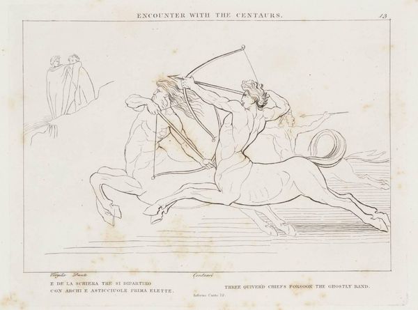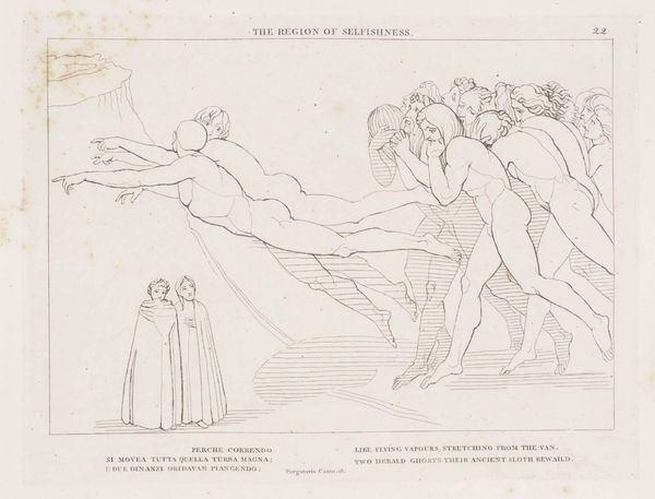 Curator: This is John Flaxman’s "The Contention for Guido de Montefeltro," and it presents such a stark, linear vision. It reminds me how intertwined morality was with artistic expression during this period. What grabs your attention? Editor: I'm struck by the drama of the scene. It feels like a battle for Guido's soul is unfolding before us. I’m curious about the figures themselves: the saint, the demon, and the dying man. What's the story behind their conflict? Curator: Well, consider the context. Flaxman, deeply influenced by Dante, uses this scene to explore themes of repentance and divine justice. Notice how the "swarthy plaintiff," likely representing damnation, confronts the saint. This reflects a broader societal debate about salvation, power, and who gets to determine one's fate. Does it challenge any preconceived notions you had? Editor: It does make me consider how these figures were viewed then versus now. I suppose it’s about understanding the visual language of morality in that era. Thank you! Curator: Precisely. Art like this reminds us that aesthetics are always embedded in the social and political landscapes.