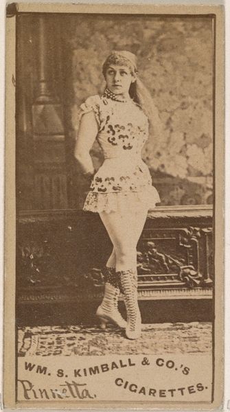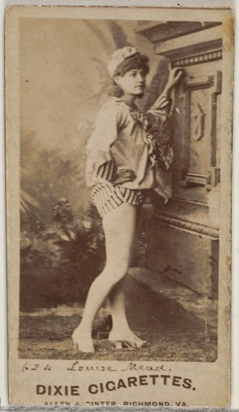 Editor: This is a portrait of Annie Summerville from the Actors and Actresses series by Allen & Ginter, dating from 1885 to 1891. It’s a cigarette card, a print of a drawing, really small and kind of sepia-toned. She's dressed as a... corsair, I guess, which was a type of pirate, leaning against a decorative wall. It has such an ephemeral quality. What do you see when you look at this? Curator: This piece is particularly interesting because it bridges the worlds of entertainment, consumer culture, and the representation of women. These cards were designed to be collected, traded, and admired, much like social media today. Think about the implications of using a woman’s image to sell cigarettes during this period. What power dynamics are at play here? Editor: It feels exploitative, but I wonder if Summerville herself had any agency? Curator: Exactly. While seemingly objectifying, these cards also offered a platform for women in the entertainment industry to gain visibility and recognition, but within very constrained societal expectations. The “corsair” costume invites questions, too. Who was able to perform certain identities, and what were the societal consequences for transgressing gender or race categories? This relates directly to theatre, of course. How does it reflect gender and sexuality norms of the time? Editor: It makes you wonder how different Annie's life might have been off stage. It is hard to know what she truly thought, but being put on a card is definitely quite something, even if she didn't have control over the process. Curator: Absolutely. Thinking about this image in terms of labor, visibility, and the complex negotiation of identity adds layers of depth. What seemed like a simple advertisement holds up to broader understandings of women in society.