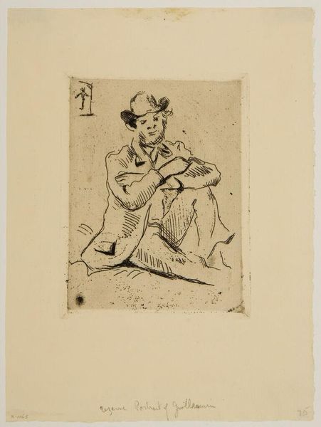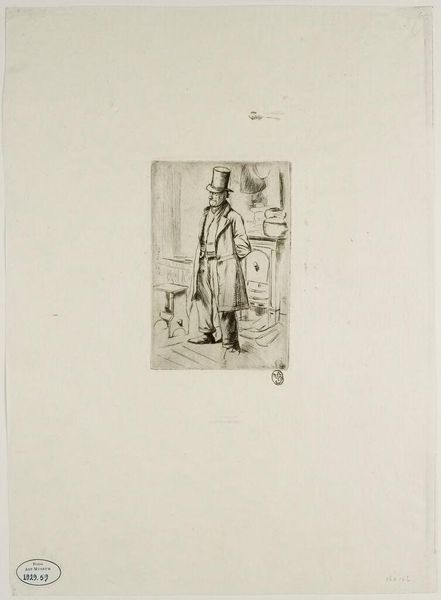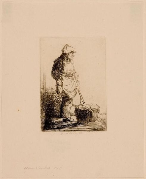 Editor: This is Andreas Achenbach's "Fish-woman of Scheveningen." I'm really drawn to the intricate textures he's created with what looks like etching. What do you see in this work, focusing on the formal elements? Curator: The emphasis lies in the contrasting textures achieved through the etching technique. Notice how the density of lines defines the form of the woman, creating a palpable sense of volume. The artist exploits line and tonal variation to create depth. Editor: So the interplay of light and shadow is key here? Curator: Precisely. Achenbach masterfully manipulates the medium to highlight the textures and shapes, emphasizing the contrast and directing the eye to the central figure. Have you also noticed the lines that form the shape of the woman's face? Editor: It's fascinating how much detail he achieves with such a limited palette. Thanks, I am beginning to think differently about this piece. Curator: Indeed, the power of form is undeniable, and I have learnt something new from you too.