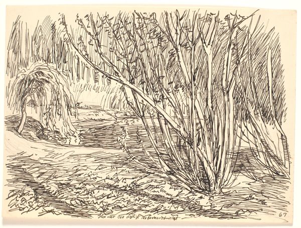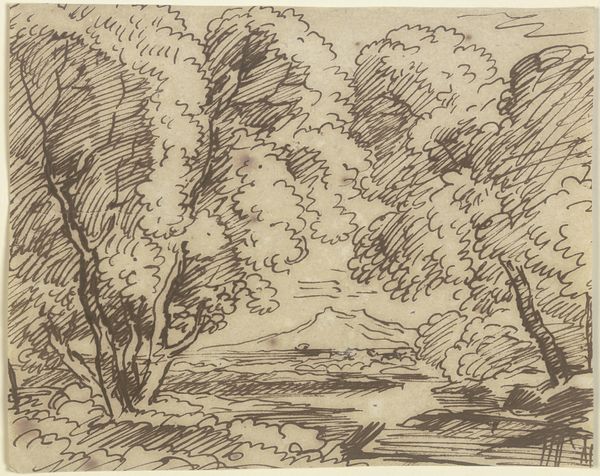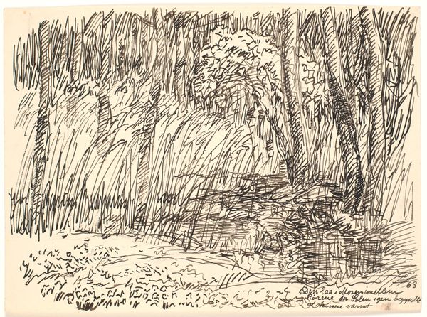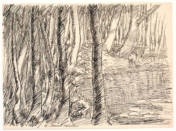 Editor: This is "En skovsø," or "A Forest Lake," by Fritz Syberg, made in 1928. It’s an ink drawing, and the loose lines give it such a raw, immediate feel. What's your take on how this fits into the broader context of landscape art at the time? Curator: It's a fascinating piece in terms of its socio-political positioning. Consider the late 1920s; modernism was exploding, and yet here is Syberg, engaging with landscape. But is he doing so in a way that simply romanticizes nature? Or is there a deeper dialogue occurring? Look at the frenetic energy of the linework - does it convey the anxiety of a rapidly changing world perhaps? Editor: That's an interesting point about the anxiety. I guess I hadn't considered how social upheaval might be reflected in what appears to be a simple landscape. Does the medium, ink, play into that at all? Curator: Absolutely. Ink drawings at this scale, while seemingly intimate, could be reproduced relatively easily through printing. Was Syberg perhaps envisioning a broader audience? Think about how print media shaped public perception of nature and national identity during this period in Denmark. It might speak to ideas around shared resources and public space. Editor: So, this drawing, while seemingly just a tranquil scene, might actually be a statement about the relationship between the public and their environment? Curator: Precisely! It also subtly comments on the role of art itself. Syberg isn’t painting grand allegories but capturing the everyday. How does this democratize the aesthetic experience? Editor: I hadn't thought of it that way. Seeing art as part of a bigger cultural conversation really changes how I understand it. Thanks for pointing out that relationship! Curator: And I'm reminded how seemingly straightforward landscapes often carry complex social messages. It shows how museums can re-evaluate historical contexts!
