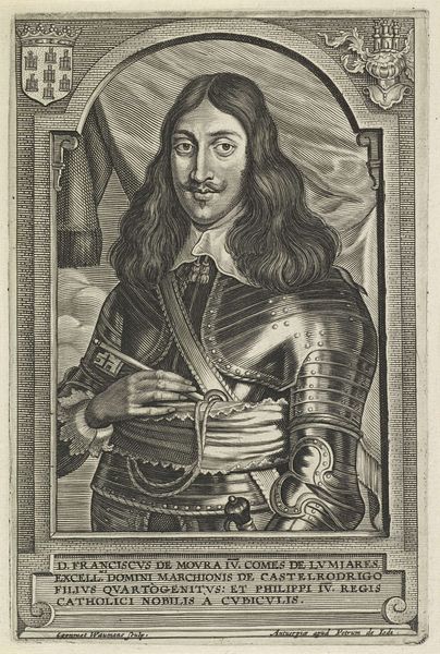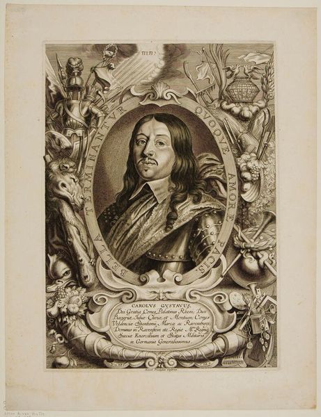 Editor: So, this is “Trosje druiven,” a print by Jean Bernard, dating sometime between 1775 and 1833, currently held at the Rijksmuseum. It looks like an engraved portrait of a regal gentleman surrounded by ornate decorations and text. It seems so detailed! How would you interpret this work? Curator: Looking at the materials, this engraving represents a crucial moment in the democratization of art. The proliferation of prints allowed images and ideas to circulate in a way previously unimaginable. Consider the labour involved: the skilled artisan meticulously transferring an image onto a metal plate, a process itself reflecting a culture of craft and precision. The depicted Charles X Gustav of Sweden is elevated through this material means of production. The inscription and symbols surrounding him point to the specific conditions and material power dynamics of his reign. Editor: That's interesting. I was just seeing it as a fancy picture, but you're highlighting how the making of it changed how art was seen by different people. What's the significance of the frame around the portrait – the armor and strange creatures? Curator: These elements are deeply connected to the social and material circumstances. Armor symbolizes military strength, while the strange creatures, and even the text are not just decoration but visual tools. Reflect on their production and consumption. Where were such materials sourced and who consumed them, considering the class structures of the time? The abundance showcased in this engraving tells a particular story about how elites wielded their authority, both symbolic and material. Editor: So, it’s not just about who he was, but about how the image itself participates in systems of power and consumption? Curator: Exactly! The choice of engraving as a medium and the style's opulence reflect a desire to disseminate a particular message, rooted in material wealth and social standing. Editor: This gives me so much to think about regarding access, artistic choices, and material culture! Thanks for opening my eyes to this new perspective. Curator: It’s a pleasure! The materiality always whispers its own historical narrative if we lend an ear.
