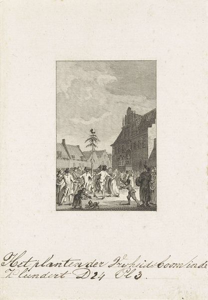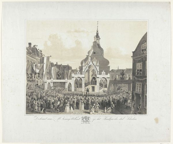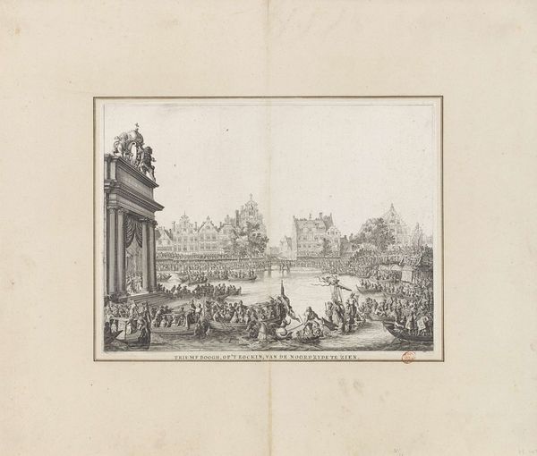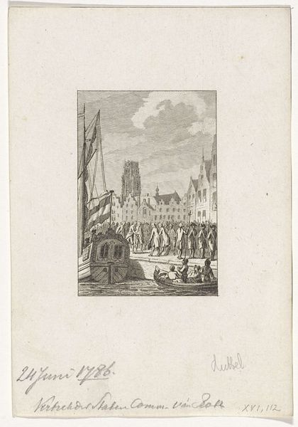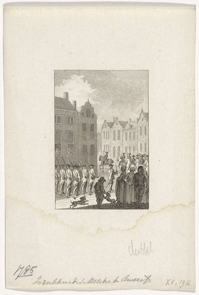 Editor: This engraving by Reinier Vinkeles, titled "Funeral Procession for Joachim Maurits Baron van Kropff," dates back to the late 18th century. There’s a somber feel to it, with the regimented lines of mourners against the backdrop of that imposing building. What strikes you most about this piece? Curator: I see a carefully constructed representation of power and societal structures. The baroque style, while seemingly traditional, here visualizes a very specific hierarchy. The baron's funeral wasn't just a personal event; it was a public display of his status and the power dynamics at play in that society. Consider the context – late 18th century, a period of enlightenment ideals, but also deeply entrenched aristocratic privilege. What does this contrast suggest to you? Editor: I guess it shows how ingrained the old systems were, even as new ideas were circulating. The presence of the military adds to that feeling, right? Curator: Precisely. Military presence underscores authority. Ask yourself, who gets a funeral like this? Who is excluded? How might those outside the elite perceive such a display? Think about issues of representation, or lack thereof, within this image, and the political statement it implicitly makes about the era. How does the 'cityscape' background contrast to this funerary march of solemn looking mourners, creating different moods? Editor: It does highlight the stark contrast between everyday life and this grand display of mourning for someone powerful. Curator: And who is controlling this narrative through this "history-painting," what is the engraver suggesting or celebrating through a funeral for someone in a position of power and stature? Also who are the intended consumers of such printed material? It reveals that funerals are highly formalized public events where certain traditions had to be recognized and duly enacted. The composition highlights this. Editor: It’s been really interesting to consider how even a funeral procession can reflect broader societal power structures. I definitely see the piece in a new light now. Curator: Indeed, by exploring such events we unpack hidden ideologies embedded in the art itself and encourage meaningful dialogue around historical contexts.