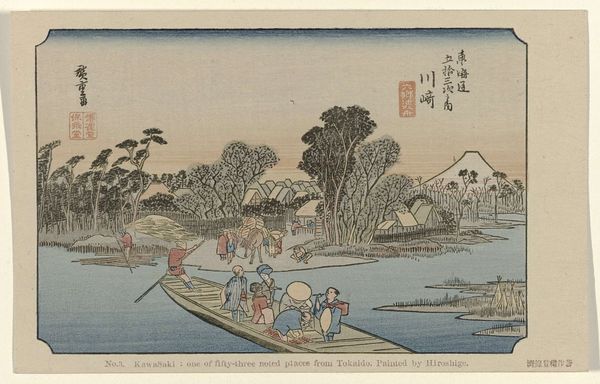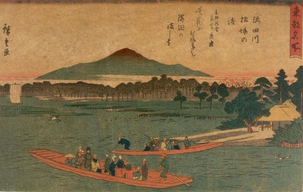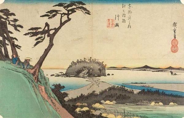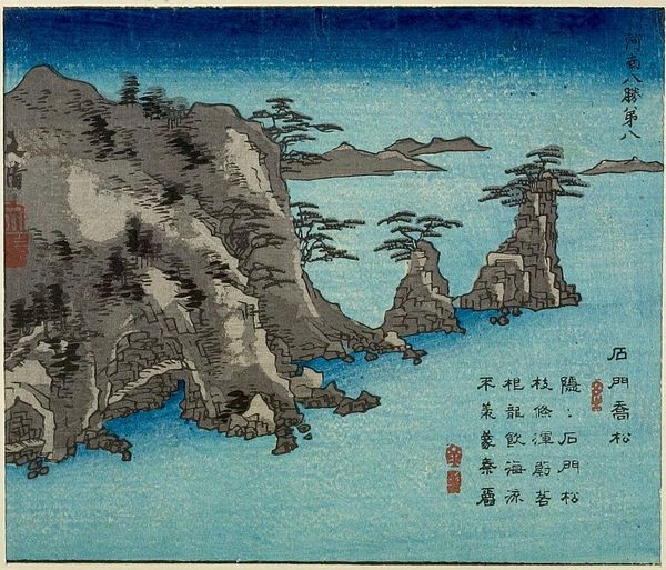 Editor: Here we have Bunsei’s "Landscape with Chinese Poem," a print on paper. The composition feels very balanced with the land masses on either side. What strikes you most about the formal elements at play here? Curator: Note the use of perspective: the high vantage point allows a comprehensive view, yet flattens the spatial relationships. The poem inscribed at the upper right is an integral visual element, its calligraphic strokes echoing the lines of the landscape. Editor: That's fascinating. I hadn't considered the poem as a formal element rather than just text. Curator: Precisely. Its inclusion disrupts a purely representational reading, drawing attention to the surface and the artifice of the image itself. Editor: I see that now! It really changes my perspective on the artist's intention. Curator: Indeed, by analyzing these formal qualities, we gain insight into the artist's conceptual concerns.