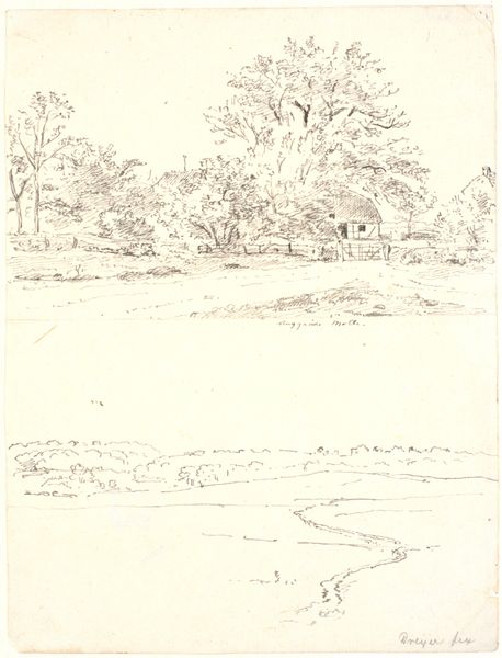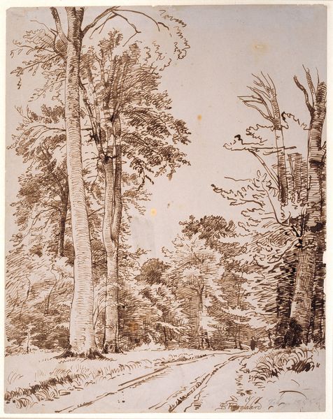Editor: This is "Parti fra Kastelsvolden," a drawing in ink by Christen Købke from 1831-1832, currently at the SMK. It's a very peaceful landscape; I’m curious about the contrast between the meticulous detail of the trees on the left, and the softer forms on the right. What do you see in this piece? Curator: What strikes me is how Købke frames this landscape, literally. He places the viewer within the bounds of the Kastelsvolden—the ramparts of the Citadel. How does situating this picturesque view within the infrastructure of military fortification change our understanding of Danish Romanticism, typically seen as emphasizing the sublime or the domestic idyll? Editor: So, it's less about untouched nature and more about nature within a political context? Curator: Precisely. We need to remember the social and political upheavals of the time. Denmark had just lost Norway. This work wasn't created in a vacuum; it reflects anxieties around national identity and defense. By depicting this scene, Købke is commenting on the role the military fortifications, such as this Citadel, play in protecting it. Is it reassuring? Or is there something mournful in it? Editor: I see your point! It makes me think about how landscapes aren't just neutral observations. The ramparts add an extra layer of meaning... the artist reminds viewers of the context of this tranquil scenery. It adds a social layer to how we approach art. Curator: Indeed. Considering art's public role helps us unravel the politics embedded within seemingly simple landscapes. Something I found interesting from researching on this is, this drawing, created during his military service, might suggest his compliance with military ideology. But then again, that’s just a point of view. Editor: That’s very insightful; I didn’t think about that at all! It encourages me to view other landscape pieces with that same political viewpoint! Thank you!