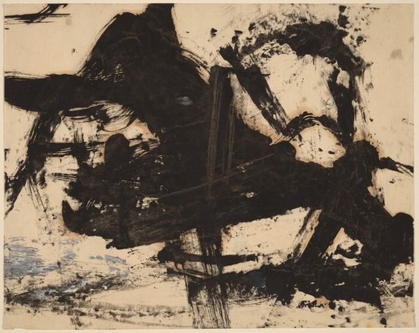 Editor: Here we have Stephen Greene's "Maw 9" from 1961-62, created with ink. It has a kind of unsettling feel, with its indistinct shapes and somber palette. What do you make of it? Curator: Greene was deeply affected by the Second World War. I think this piece reflects the anxiety and existential questioning prevalent in the post-war period. How do you see the role of abstraction in conveying these themes? Is it effective or alienating? Editor: I can see that. The ambiguity definitely adds to the sense of unease. I’m wondering if the title “Maw” is a reference to something specific? Curator: “Maw” implies a gaping opening, a void. This ties into the anxieties of the era—the potential for annihilation, the questioning of traditional values. Notice how Greene’s style aligns with Abstract Expressionism which was heavily linked with freedom of expression and implicitly freedom *from* something, what could be artist be trying to say or flee from? Editor: Maybe the pressures of conformity of the time? Curator: Precisely! Think of the socio-political context—the Cold War, the rise of consumerism. Abstract Expressionism, though celebrated, also faced criticism for being elitist. Its seeming inaccessibility made it suspect for some audiences. Does this drawing make you consider ideas and context over forms? Editor: Definitely, the background helps ground it a bit. I see the ink blots less as just "blobs" and more like reflections of his time now. Curator: Precisely. That push and pull is really important to the interpretation of abstract works. Editor: I hadn’t thought of it in those terms before! Curator: It gives us all something to consider when understanding Abstract Expressionism and Greene’s career.
