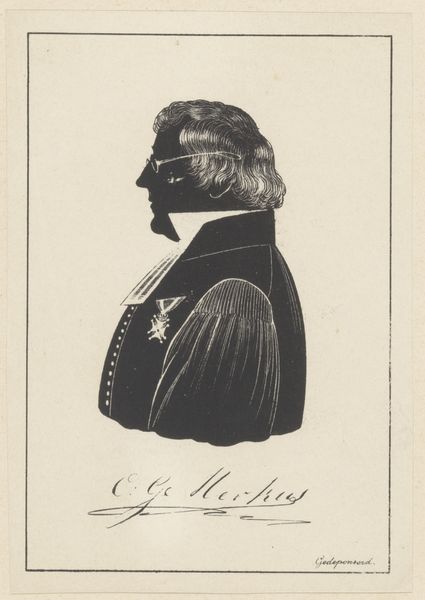Editor: Here we have a silhouette portrait of Johannes Mulder, made sometime between 1808 and 1844. It's an engraving. What strikes me is its elegant simplicity. What do you see in the composition that might reveal its artistic merit? Curator: Observe how the artist uses only a stark contrast of black and white to define the subject. It forces us to appreciate the curvature of the neck, the set of the jaw, the arrangement and the detail within the hair and, yes, even the collar’s stripes. Notice the crispness of the lines achieved through the engraving process. Do you find any particular part of the composition more compelling than the rest? Editor: I'm fascinated by how much information is conveyed with so little, especially the delicate wisps of hair around the face. The layering and density creates dimension within the two-dimensional medium. Curator: Precisely! The density and texture within the silhouette are paramount. This elevates the piece beyond a mere likeness. The textures offer complexity to a portrait of this kind. Lubbers, the artist, uses line to define form so acutely. Editor: So, focusing on the use of light and shadow reveals the piece's sophistication. I thought its plainness was simplicity! Curator: Exactly. Reducing a form to its essence highlights the artistry within its execution. The effectiveness of its restricted palette, the clean line work... its these artistic decisions which have created the effect. Editor: I never considered looking so closely at a silhouette before, thinking about the form and the construction rather than just the subject. Curator: Paying attention to the arrangement of line, the texture and composition…these unlock meaning even within seemingly rudimentary portraits.