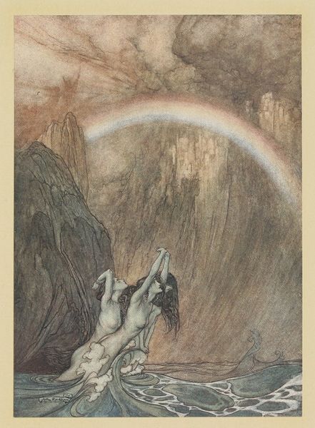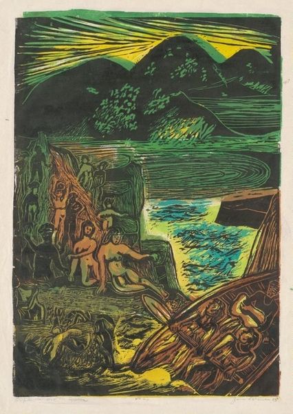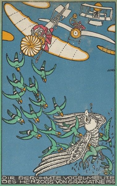 Editor: So, this is Moriz Jung’s "Rainbow Obstacle" from 1911, a graphic art print. The overall feeling I get is… whimsical, yet there’s a chaotic element. What strikes me is how he positions these two scenes, upside down from each other and connected by a rainbow. How do you interpret this work? Curator: The rainbow serves not just as a connector but as a bridge between different psychological states. Note the figures. The rider is cast from the sky and then reborn from below—it's the hero's journey in condensed symbolic form. He’s literally and figuratively facing obstacles in both realms. Editor: Obstacles like the rainbow, which is typically a symbol of hope? That feels a bit cynical. Curator: It’s more nuanced than that. Think of rainbows in folklore—promises, yes, but also illusions, ends of the earth. Jung places that classical tension in a modern setting. This isn’t a classical, reassuring landscape; it's a world grappling with modernity, visually echoed through German Expressionism's distorted forms. The rainbow is now something to overcome, not just admire. Where do you think this falls, symbolically, in light of figuration? Editor: So, instead of a romantic view, it's a symbol of the struggles and the disjointedness of modern life? It definitely makes me reconsider my initial lighthearted read. Curator: Precisely. And think, too, of the German Expressionist movement questioning societal norms, and its impact during the rise of political disruption in Europe. Images carried profound cultural weight, consciously and unconsciously, even within seemingly 'whimsical' styles. Editor: That's fascinating! I'm now thinking about the symbols and social critique present even when I least expected it. Curator: Exactly, it reveals that visual language and artistic expression is often multilayered and has connections across the conscious and unconscious elements of the artist and culture it was borne out of.