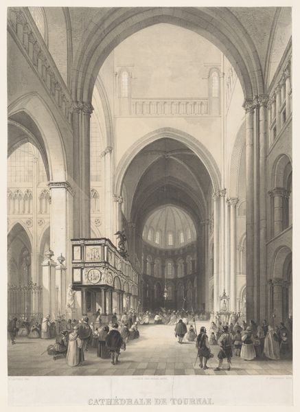 Editor: So, this watercolor painting from somewhere between 1660 and 1703 is by Isaak van Nickelen and it’s titled "The interior of Saint Bavo's Church in Haarlem." It's stunning how he captured the vastness and light of this Baroque interior. I’m wondering, when you look at it, what stands out to you the most? Curator: The enduring symbolic language of architecture itself. Observe how the verticality, the pointed arches, and the filtered light all converge to create an upward visual trajectory, almost a reaching for the heavens. Editor: I noticed that too! It definitely draws your eyes up, almost like you’re meant to follow that light. Is that a common thing in Baroque architecture? Curator: Certainly, but consider its roots, too. These weren’t simply Baroque flourishes; they are architectural symbols repurposed. Even after the Reformation, the symbolic memory of sacred spaces persisted in the cultural consciousness. Light itself, regardless of specific religious doctrine, has maintained a consistent association with the divine. What about the human figures, the everyday scenes he included? How do those figures play into this overall symbolic dialogue for you? Editor: They definitely bring it down to earth… almost like the sacred and everyday life are living side-by-side. Is that his intention? Curator: It's difficult to claim definitively 'intention' across centuries, but we can see that van Nickelen placed figures sweeping or conversing amidst grand architectural assertions, integrating them into a space loaded with symbolic weight and lived experience. Editor: It’s like he is asking what these sacred places mean in our day-to-day lives. Curator: Precisely. And the perspective almost puts *us* within the scene, not just viewing it from a distance, further blurring that distinction. Symbolism in art, and in life, is never static. What it signifies changes across generations, evolving with our collective cultural experiences. Editor: That’s a great point; I guess symbols are constantly being redefined. Thanks so much; that’s given me so much to think about.