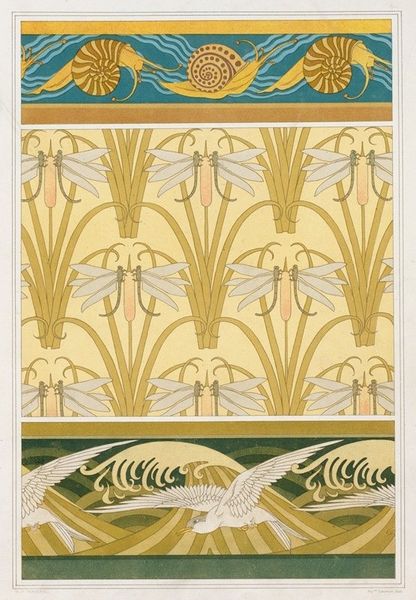 Maurice Pillard Verneuil created Iris 2 to explore decorative patterns, likely in the late 19th or early 20th century. The artwork, divided into three distinct sections, showcases the iris flower in various stylized forms, each employing a unique arrangement of color and line. Notice how Verneuil uses the iris motif to explore ideas about repetition and variation. In the top right, the iris becomes a dense, wallpaper-like pattern where each flower is meticulously replicated to create a field of visual harmony. The lower section presents a rhythmic, linear pattern with the irises interspersed with sinuous water-like forms, evoking a sense of flow. In contrast, the panel on the left offers a more naturalistic depiction, framed as if it were a stained-glass window. Here, the formal elements—line and color—serve to capture the essence of the iris in a more lifelike manner. Each section functions as a study in how an image can be deconstructed and reassembled, inviting us to consider the interplay between art, nature, and design.