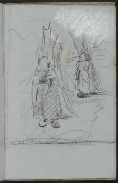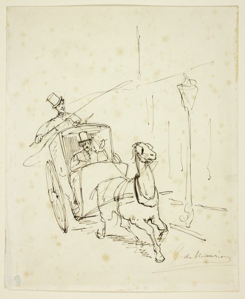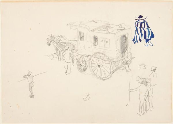 Curator: This is a sketchbook page by Gabriel Jacques de Saint-Aubin, currently held at the Harvard Art Museums. Editor: Immediately, I am struck by how the simple lines convey a sense of fleeting movement and the hustle and bustle of a bygone era. Curator: Indeed. Saint-Aubin often depicted scenes of Parisian life, reflecting the social structures and burgeoning public sphere of 18th-century France. The carriage, for instance, was a potent symbol of status. Editor: Look at the figures around it! Are they entering, exiting, or merely observing? This image raises questions about access and participation. The carriage itself is a world, set apart from the pedestrians. Curator: Precisely. The quick, almost shorthand drawing style hints at Saint-Aubin's method of rapidly capturing moments of public life. The fleeting nature of the sketch also mirrors the ephemeral nature of social standing. Editor: It's interesting how the lack of detail almost enhances the emotional impact. The vagueness allows viewers to project their own interpretations onto the scene. This feels like a memory, not a portrait. Curator: A fitting way to describe how social history endures through images, and is interpreted by future generations. Editor: Yes, and how fleeting visual symbols speak volumes across time.