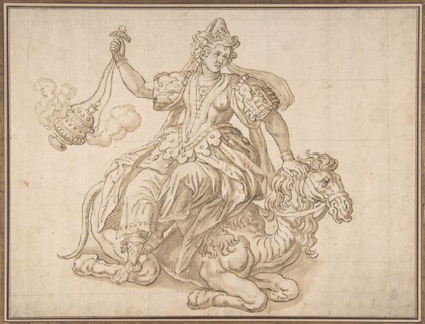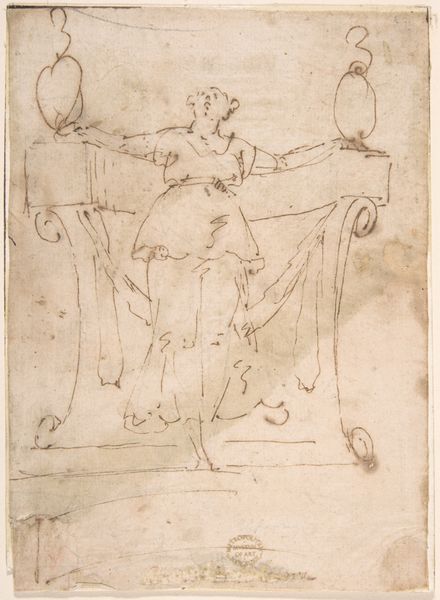Curator: Conrad Mantius, around 1600, sketched this figure, "Kniende Frauenfigur mit Palmenzweig (Fides)," in pen and brown ink. What leaps out at you initially? Editor: A hesitant hopefulness. The ink work feels tentative, and the figure, though regal, seems to clutch the palm branch, almost unsure. There's a certain fragility. Curator: Exactly! And think about the act of drawing itself at this time. The relative scarcity of paper; each line was a deliberate investment. Mantius likely used iron gall ink. The transformation of simple ingredients into a permanent, symbolic mark, speaks volumes. Editor: Ah, you’re drawing attention to the economy of it all! And yes, that raw process... Imagine preparing the ink from gallnuts and vitriol, maybe grinding pigments. It roots us in the physicality of artistic creation. Do you find the inscription informs the work? Curator: Profoundly. “Be faithful until death, and I will give you the crown of life.” The drawing is an exercise of Faith. She kneels, but on what exactly? Editor: I wondered! It looks like a crumpled cloth—ordinary, tangible. Is that a commentary on faith itself being something that's embodied? What strikes me is the stark contrast between the woman’s ornate headdress and simple garments. How much did the materials and time it would take to make something more embellished affect the overall finished form of the drawing? Curator: Maybe she herself is crafted not unlike the ink from simple origins to embody something more, to become more elaborate over time, and maybe like you’re implying, that’s the real beauty and strength in her story. I appreciate the simplicity in the drawing, it has something essential and earnest. Editor: That earthiness elevates what could be just another allegorical drawing to something intensely personal.