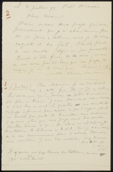 Curator: Here we have “Brief aan Christiaan Kramm,” or “Letter to Christiaan Kramm,” possibly from 1839. The work, housed in the Rijksmuseum, is ink on paper. Editor: The flow of the lettering really strikes me. It feels delicate, like a dance. I’m drawn into the script’s texture on the page, and I wonder about the hand that made it. Curator: Notice the meticulous arrangement, the careful strokes forming each character. The calligraphy reflects the Romantic era’s focus on the beauty of expression through formal control and refinement. It’s a testament to how language itself could be elevated to art. Editor: Absolutely, and consider the material conditions. The crafting of ink, the preparation of the paper – these processes involved skill and time. This was an act of creation in a very material sense. How would this differ depending on whether the writing instrument was, say, feather or steel? Curator: A good point. The very tools and materials shape the final outcome. This letter as object presents both the physical substance and its coded message. Editor: The social context is also crucial here. Letters were integral for communication at the time, a crucial tool. Analyzing them, in contrast to a drawing of landscape for example, roots it in human affairs. Curator: Indeed. Think of the constraints placed on artists as dictated by society and material availability, contrasted against a work like this one, with very clear conventions of style. It brings forth notions of authorship and skill within limitations. Editor: It reminds me to value not just what is communicated, but the physical and social processes that enable communication in the first place. Curator: And I'm newly attentive to the dialogue between freedom and form in artistic expression.