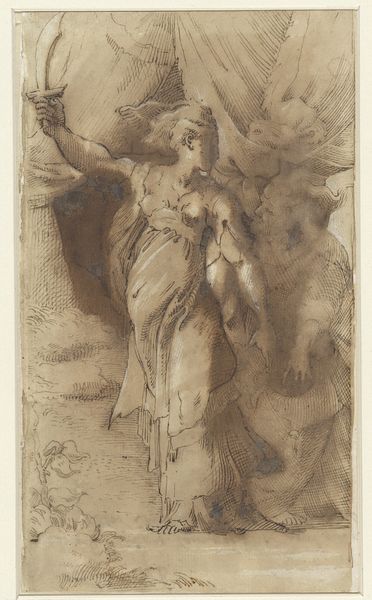 Editor: This is Raphael's "Caryatid," a chalk and charcoal drawing from around 1520. There's a fluidity and softness to it that I find captivating, almost like she’s emerging from the paper. What strikes you most about this drawing? Curator: What’s striking is Raphael's ability to evoke classical antiquity in a period of intense political and religious change. He's not just depicting a nude figure; he’s engaging with a tradition where the body represented civic virtue and idealized form. How do you think its display within a museum setting today influences how we read those historical implications? Editor: That’s a really good point. I guess seeing it here, it's almost…decontextualized? The history isn’t immediately apparent, but the virtuosity still shines through. Curator: Precisely! Museums create narratives. We're seeing Raphael through a specific institutional lens, one that often prioritizes artistic genius, sometimes obscuring the social functions this imagery served. Have you considered how this kind of idealised image played a part in consolidating power structures in Renaissance society? Editor: Not really, I guess I'm so focused on just… how pretty it is, honestly. But you’re right, it's impossible to separate it from the broader context. Curator: The beauty IS intentional, but its purpose moves beyond the aesthetic. Reflect on who got to view works like this. It wasn't the masses; it was elite circles. Therefore, such drawings served to legitimize specific forms of governance. Editor: So, the art becomes a symbol of power, a way to visually reinforce the existing hierarchy? It’s a pretty different way of thinking about Renaissance art than what I learned in class. Curator: It's a way to think critically about how museums like this one, display and, by extension, interpret artworks from vastly different eras for a contemporary audience. That tension – between raw artistic talent, historical context, and modern accessibility -is at the very core of this institution's ongoing project. Editor: Wow. I'll definitely think differently next time I see a nude drawing from the Renaissance! Thanks.