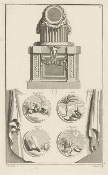Jean Charles Delafosse created this print, Muziek en Geneeskunde, using etching in the 18th century. It cleverly embodies the Enlightenment interest in classifying knowledge. Made in France, the print is split into two halves, each representing a different discipline. The upper section, ‘La Musique,’ features instruments like a lyre and trumpet, surrounding a medallion with a set of scales, perhaps suggesting the balance and harmony inherent in music. Beneath this, 'La Medecine,' with a serpent-entwined staff and a rooster atop a globe, symbolizes healing and watchfulness. These were conventional visual codes at the time, understood by a broad public audience. Delafosse was an ornamental engraver, commissioned to make this print. But the image also reflects the social and institutional structures of 18th-century France, where disciplines were being organized and categorized in new ways by institutions like the Academies. Understanding this print requires us to consider its historical context, delving into the social and intellectual history of the Enlightenment.