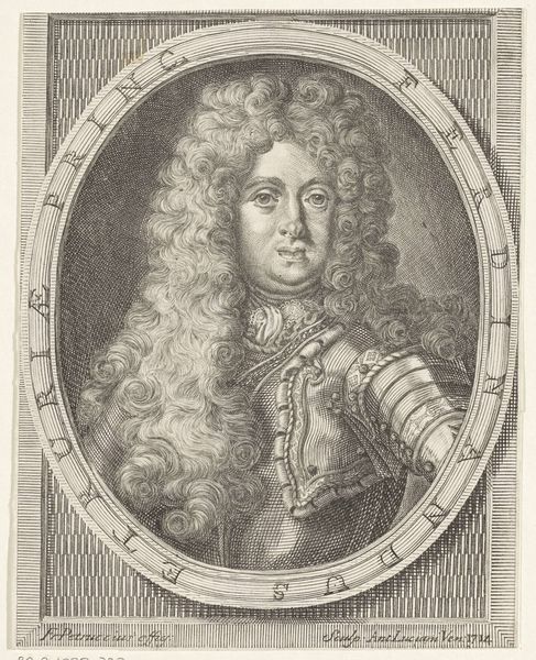 Gérard Edelinck made this print of Louis of France, Duke of Burgundy, using burin and etching techniques. The image creates meaning through visual codes typical of royal portraiture in France. Note the armor, meant to convey strength and leadership. Also, take note of the oval frame, this shape was often chosen to represent an ideal form of the sitter. It is interesting to consider how these images were used by the institutions of the French court. Were these images intended for wide distribution, or were they more private symbols of power and prestige? To understand this portrait better, you might research the history of the French monarchy, the conventions of royal portraiture, and the role of printmaking in disseminating images of power. The meaning of art is always contingent on its social and institutional context.