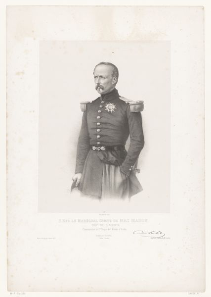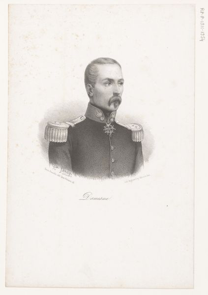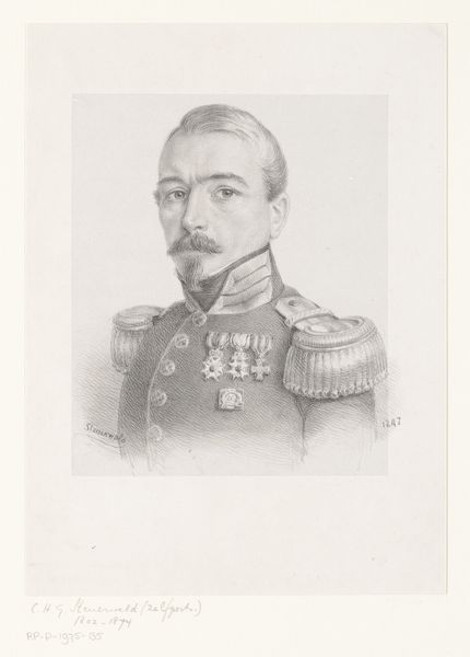 Editor: So, here we have a pencil drawing entitled "Portret van generaal François-Marie-Casimir de Négrier" made sometime between 1832 and 1861 by Léopold Massard. I'm immediately struck by how...official it feels, yet there's a starkness in the medium. What do you see in this piece, considering the social and historical context? Curator: It's fascinating how a seemingly straightforward portrait can reveal complex power dynamics. This image, though rendered with academic precision, invites us to consider the role of military figures like General Négrier within a specific historical frame. His medals and uniform, symbols of authority, can also be viewed as representations of state violence, especially when thinking about the historical moment this was created, likely during a period of colonial expansion. How does his gaze make you feel? Does it evoke trust or something else? Editor: Hmm, I think there's an element of detached authority in his gaze. Knowing the context, the pencil medium itself makes me think about accessibility - a portrait made when photography was rare maybe, a kind of dissemination of power through image making. But what about his individual identity? How does this artwork relate to issues of personal identity versus public persona? Curator: That's an important point. While the portrait serves to solidify his public image, it also prompts questions about his internal life and experiences. How might Négrier have perceived his own role in shaping France’s colonial ambitions? We can read the portrait not only as a symbol of power but also as an artifact of a specific social class, one shaped by notions of duty, honor, and nationalism. To what extent can portraiture allow a critical assessment of historical figures? Editor: I see. The drawing prompts critical questions about the figure's position in systems of power. Now I’m viewing not just a portrait, but a lens into 19th-century France’s complex relationship with militarism and identity. Curator: Exactly. Thinking about artworks this way allows us to use them to interrogate the social constructs they represent, instead of just celebrating them uncritically.