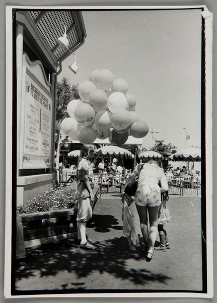 Curator: Bill Dane's photograph, simply titled "Untitled (San Jose, Costa Rica)," captures a group of people amongst a stand of trees and public telephones. It's a study in public life, intimacy, and the technology that mediates it. Editor: It's like a little theatre scene! All these figures caught in the act of communicating—or waiting to. The light feels almost oppressive, like a memory baking in the sun. Curator: Yes, Dane's work often explores these fleeting moments of connection. In this context, public phones were once vital. The photo reminds us that access to communication technology isn't, and never has been, universal. Who could afford these calls? Who was excluded? Editor: Exactly! It's a visual poem about accessibility and the economic strata embedded within communication. The trees act as a backdrop, reminding me of the natural world in stark contrast to these metal booths. Curator: I think what's powerful here is how Dane refrains from judging. There's a quiet observation—just people, trying to reach each other. Editor: And maybe that's the point, right? Reaching out—across distances, across divides—is a fundamentally human endeavor. This image captures the messy, sometimes beautiful, ways we attempt that.