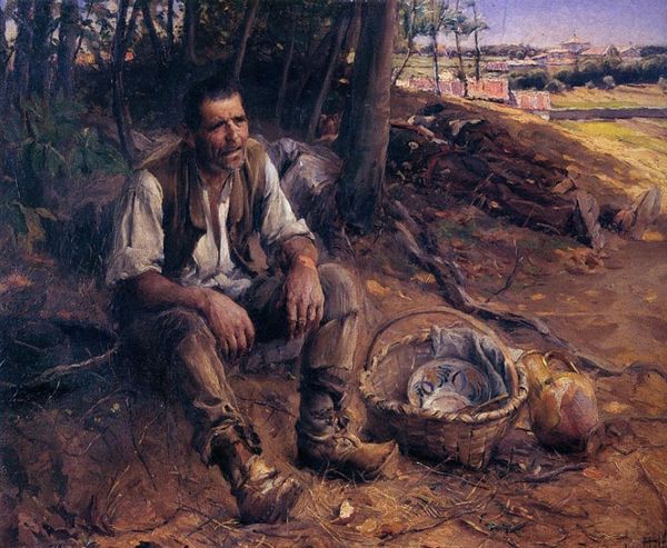 Curator: August Jerndorff painted this intriguing plein-air portrait in 1889. It’s titled “The Architect Thorvald Bindesbøll in a Spruce Forest on Kullen.” Editor: My first impression is of a rather weary subject. There’s a distinct asymmetry to his pose. He looks like he’s pulled a muscle, or is perhaps just overcome by the forest itself. Curator: Well, Bindesbøll was a prominent architect and designer. Given the Impressionistic style, it likely captures a casual moment away from the structured world of architecture, and an intimate glimpse into the subject’s life and interests. It highlights a different, more personal side of a public figure. Editor: True, there’s a freedom to the brushstrokes that reflects this setting, especially within the dense foliage surrounding him. Note how Jerndorff uses the play of light and shadow to define Bindesbøll's form against the forest backdrop. See how the angles in the trees play with his silhouette? Curator: It’s interesting to consider the social context. Bindesbøll was part of the artistic and intellectual circles of the time. Kullen was likely a place of retreat where ideas were exchanged, and artistic experimentation fostered, evident in Jerndorff’s Impressionistic handling. One must wonder if being captured so informally would play into his public persona. Editor: The composition’s reliance on tonal values gives it a somber feel. While Impressionism celebrates light, this portrait explores a darker register with shades of brown and green that dominate. See how the subtle highlights catch the contours of his face and hands though; that touch of realism contrasts to the loosely painted surrounding trees. Curator: Also, consider how the choice to paint this en plein air suggests a desire for authenticity. There's a romantic association with nature as a source of inspiration and escape, further reinforced by this being on the cusp of major urban expansion and artistic movements. Editor: Absolutely, I'd suggest this contrast—of formality and informality—gives the work its resonance. The portrait teases out a tension, I feel, between the architect's cultivated image and his more raw existence within nature. Curator: Indeed. Jerndorff offers us more than just a likeness; he gives us a study of a man, his environment, and the forces shaping both. Editor: A rich tapestry of form, light, and shadow—a potent intersection of lived experience.