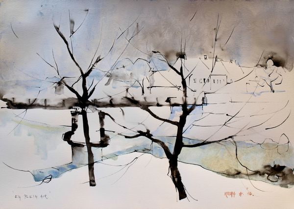 Alfred Freddy Krupa created this artwork, Abandoned rural estate, using the medium of painting, and sized at 60 x 73 cm. Krupa’s origins in the tumultuous socio-political landscape of the former Yugoslavia profoundly shaped his artistic perspective. Born in 1971, his formative years coincided with intense ethnic and nationalistic conflicts which displaced communities and uprooted identities. This painting, with its stark monochrome palette, hauntingly reflects themes of displacement and abandonment. The rural estate, rendered in fluid brushstrokes, seems to dissolve into the white background, evoking a sense of loss and impermanence. The black ink bleeds across the paper, mirroring the bleeding of cultural identities amidst conflict. The ghostly presence of the trees hints at resilience and endurance. “Watercolor is an attitude toward life,” Krupa has said, highlighting the importance of embracing fluidity and change. This artwork serves as a poignant reminder of the human toll of socio-political upheaval, capturing the emotional residue of vanished places and fractured communities.