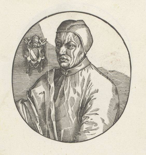 This is Melchior Lorck's "Bust of a man with beard and calotte," a small yet intricate drawing. The dense cross-hatching technique creates a stark contrast, evoking a palpable sense of texture. The man's gaze, directed slightly off-center, draws you into the image, fostering a sense of intimacy. Lorck's use of line is particularly striking. Note how the lines not only define form but also convey the weight and density of the beard and fur collar. Semiotically, the beard and calotte serve as signs of status and cultural identity. The octagonal boundary is divided horizontally into three sections, each with a different type of line: vertical, horizontal, and cross-hatched. This can be seen as an exploration of the semiotic possibilities inherent in lines. Ultimately, Lorck's manipulation of line and form invites us to reflect on the interplay between representation and reality, challenging fixed meanings and categories.