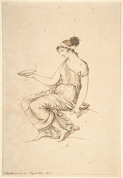 This drawing, titled "Scene of Dancing Maiden and Seated Woman," was made with pen and brown ink, and brush with brown wash, over black chalk on paper by an anonymous artist. The choice of materials here – humble paper, basic drawing implements, and the monochromatic palette – sets the stage for a study in form and movement. The artist has allowed the inherent qualities of the ink and chalk to guide the process. The ink, fluid and responsive, captures the flowing drapery and the graceful gestures of the figures. The textured wash adds depth and volume, suggesting the weight and presence of the bodies beneath the fabric. The use of these materials connects the artwork to a broader tradition of preparatory sketches and academic exercises. This approach, focused on process and skill, challenges the traditional hierarchy between finished artwork and preliminary study. It reminds us that even in the simplest of materials, profound artistic expression can be achieved.