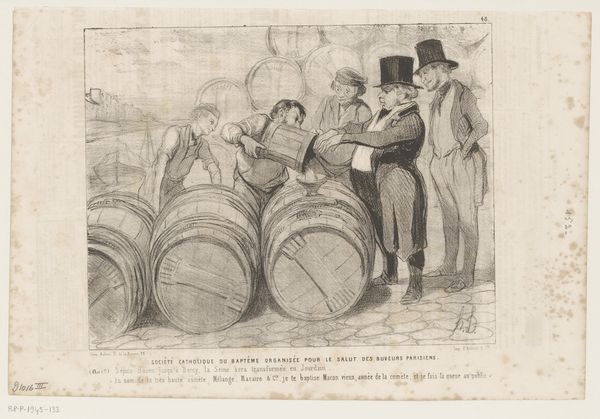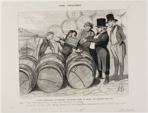 Curator: Here we have Honoré Daumier's lithograph from 1856, titled "In Bercy. 'We are doing everything to avoid that the river Seine overflows... and there are still people who are questioning our good intentions,' plate 321 from Actualités". Editor: My first thought? A melancholic satire, capturing human effort in the face of, perhaps, futility. It's gritty, almost oppressive with those looming barrels. Curator: Oppression is a keen observation. Daumier, a master of social commentary, uses lithography—a printing technique allowing for broad distribution—to address concerns about the Seine and civic responsibility. Bercy was, and is, a warehousing district for wine and spirits near the Seine. Editor: Right. So, there's that interesting dichotomy between something celebratory, like the barrels, and the more sobering image. These laborers, bent under their tasks, the dark hatching giving the whole thing this somber, critical edge. Almost as though this optimism about taming nature, as written in the print's title, rings hollow to the artist himself. Curator: Indeed. The visual weight of the barrels suggests a system teetering under its own abundance, if not outright negligence. It reflects a growing skepticism towards those in power, doesn't it? The materiality—the cheap, reproducible lithograph—amplifies his message. He's taking aim at civic negligence and empty promises, producing accessible, biting criticism for the masses. Editor: And the characters’ cartoonish features! The exaggerated noses… it all makes it wonderfully clear how flawed Daumier believes their grand scheme to be. It becomes less about their struggle with wine storage and more about their relationship to their responsibility to something far larger than themselves. It almost mocks a disconnect from their humanity. It is all pretty affecting stuff! Curator: Precisely. A complex blend of Romantic ideals and a nascent realism emerges. Editor: It really gives you pause, doesn't it? You think, "How far have we truly come?" Curator: An apt reflection to end on, suggesting timelessness!