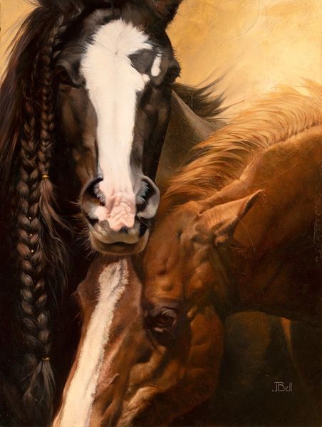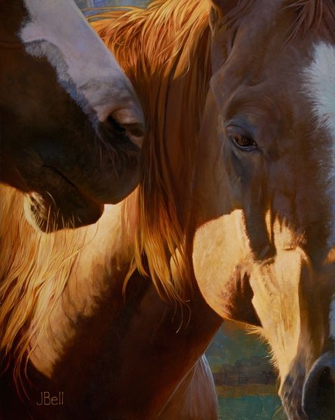 Curator: What strikes me immediately about "A Golden Wind" is the dynamism. The musculature of the horses is rendered in such exquisite detail. They appear caught in a moment of unfettered movement across this landscape. Editor: I can see that, but I wonder what statement, if any, Julie Bell might be making here about wildness or freedom. Are these romantic ideals or do they hint at something deeper within the narrative of humans relationship to nature? How did representations of animals figure in Bell's practice? Curator: Julie Bell is an American artist primarily known for her fantasy and bodybuilder artwork. While a specific date for this piece is unavailable, we can appreciate it as another powerful portrait. The energy radiating from it almost feels tactile. Editor: And is this power somehow distinctly gendered in her work? I wonder if an analysis reveals broader themes within feminist art history--representations of strength, beauty, and the natural world coming together? Are we viewing equine subjects as symbolic representations of freedom or commenting on our desire to control them? The painting can almost be read as an open text where one might engage social theory to challenge existing hegemonies surrounding human interaction with other beings. Curator: You pose very compelling questions! Let's observe the composition further. Bell's employment of color evokes a sense of drama, that sunset suggesting temporality, those reddish and ochre colors infusing a dramatic and beautiful sky which acts as an idyllic backdrop to the herd. Editor: Absolutely. The backdrop provides context, but to see this landscape through a lens attuned to current ecological concerns invites interpretations related to environmental impact and preservation, situating it squarely within conversations about the Anthropocene and potential implications of uncontrolled expansion. Curator: That’s a vital perspective to consider! Thank you for this illuminating point of view. Editor: Thank you; considering art with multiple viewpoints certainly enhances its richness and provides fresh narratives to examine.