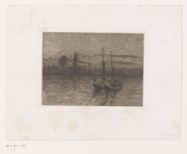 Jules Guiette's delicate etching presents two sailboats on a tranquil lake, with a distant tower subtly piercing the horizon. The sailboat, a potent symbol, has navigated the currents of human history, appearing in countless forms across cultures and epochs. From ancient Egyptian barques carrying souls into the afterlife to Viking longships embodying exploration and conquest, the vessel motif embodies humanity's yearning for transcendence. Consider also the Christian allegories of the Church as a ship, guiding believers through life's turbulent seas. In Guiette's composition, the water mirrors the sky, blurring the boundaries between the earthly and the celestial, evoking profound psychological resonance. We find ourselves drawn into a meditative state, contemplating the cyclical rhythms of life and the subconscious echoes of collective memory. These symbols possess a non-linear trajectory, constantly resurfacing, evolving, and assuming new significance within diverse historical tapestries.