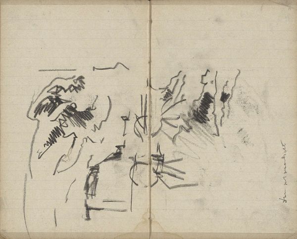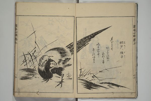 Curator: Here we have a page from Tachibana Morikuni's sketch book, "The Moving Brush in 'Rough' Painting," created around 1749. It's currently held at the Metropolitan Museum of Art. What's your immediate impression? Editor: There's a lovely simplicity. The ink strokes seem almost hurried, yet there is incredible balance, contrasting dark bold depictions alongside what almost feels like translucent renderings, it looks dreamlike. Curator: The beauty of this sketch book really lies in understanding its context. This wasn’t necessarily about creating perfect images, but exploring the potential of materials and the speed of mark-making, especially with ink on paper. This suggests a unique and valuable commentary on the labour inherent in creating this sort of traditional imagery, doesn't it? Editor: Absolutely. I also find the choice of plum blossoms interesting; plum blossoms are powerful symbols of resilience and renewal, especially since they bloom in late winter, heralding the arrival of spring. That combined with the artist on the opposing page presents this profound duality - someone who seems to be creating, depicting or otherwise appreciating these hopeful harbingers. The themes are subtly powerful. Curator: Considering the relatively quick nature of the execution, what you call the 'rough' painting aspect, you wonder if it was created during winter specifically. Perhaps there's an unseen dialogue regarding the labour process in relationship to the seasons. It almost invites one to see if any specific natural pigments could be found that indicate time or place, Editor: Indeed. This image book page also allows us to access a bit of Morikuni’s artistic mind at work. Seeing how these images interact within the sketchbook format invites viewers to imagine other possible interpretations. The narrative potential in that is fascinating. Curator: A potent reminder of the rich dialogue that material investigation offers. There is always much more to be excavated than immediate iconography! Editor: True enough, each reveals something that the other obscures; I think together we gain more insight to appreciate the beautiful nuances captured on this page.