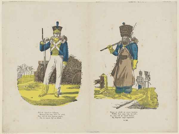 "Soldaten", or Soldiers, by Glenisson & Van Genechten, is a print made with lithography, a process that allows for images to be reproduced quickly. The image shows two smartly outfitted soldiers in green, red, and yellow uniforms, with a poem underneath each. The lithographic process is key here. It would have allowed for the relatively inexpensive production of images and texts for popular consumption. While the artist may have made a unique drawing, its reproduction enabled widespread distribution. The print's social significance lies in this accessibility, bringing images of military prowess and patriotic verse to a broad audience. It blurs the lines between art, propaganda, and commodity, reflecting a society where images and ideas could circulate widely, shaping public opinion and national identity. This artwork prompts us to consider how materials, making, and context converge to shape the meaning of an artwork.