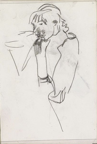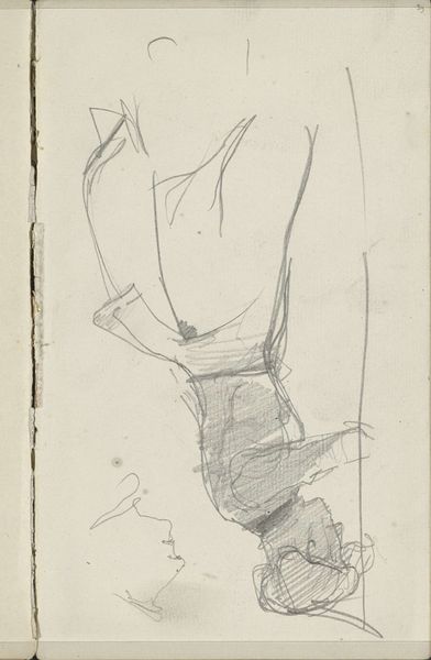 Curator: Look at this drawing; Isaac Israels captured this pensive scene, “Vrouw die uit een kop drinkt,” sometime between 1875 and 1934. It's here at the Rijksmuseum, and rendered in pencil. What's your immediate take? Editor: Well, my first thought goes to the artist's process. I mean, you can see every mark, the visible labor of each stroke. It feels incredibly immediate and unfiltered. The simple act of sketching like this implies something almost fleeting, doesn’t it? Curator: Exactly! Israels, deeply rooted in impressionism, emphasizes the moment. It's like he's capturing the quiet intimacy of daily life. Notice how the composition is quite bare; it leaves room for our imagination, don't you think? The focus truly shifts to her posture and cup itself. Editor: It also highlights the humbleness of the act itself. Coffee, or perhaps tea. The quotidian—it underscores that her hands and the cup are just as important, labor-wise. The cup isn’t just a thing; it represents an entire network of extraction, manufacture, distribution. It all adds an economic context, doesn't it? Curator: A sharp contrast, as well. There’s also something deeply melancholic about this; the woman drinking almost disappears into this humble act, shadowed under what I find to be this wonderful yet simple play of light. What resonates, for me, is his emotional truth here; it’s an intimate character study through very limited means. Editor: True, but pencil drawings, at the time, also played a huge part as commercial objects—think newspapers, books, posters. In that context, drawings were often the first stage of image production; something gets a little lost when thinking only of high art and the singular object, right? Curator: A worthy challenge, because perhaps that tension is what makes this drawing, or even study, so engaging: we are offered a glimpse behind the curtains, while we confront our biases about craft itself! Editor: Exactly! It's like the artist wants us to remember art as both a physical thing, and as an idea… perhaps one fueling the other. Curator: I must say that looking at the piece and analyzing it together like this is a testament to the artist’s success, making a moment like this so alive through something as common as a pencil! Editor: I concur! It’s truly rewarding when materiality, method, and historical reflection offer so many different angles, allowing you to appreciate more something we take for granted.