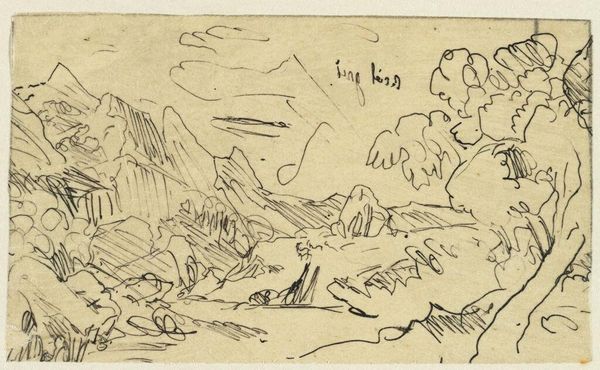 Editor: This is "Landscape" by Rodolphe Bresdin. It's undated but held at the Harvard Art Museums. It's a very small drawing, almost pocket-sized. What strikes me is the density of the lines. What do you see in this piece? Curator: Indeed, the density is a key element. Notice how Bresdin uses line not just to delineate form, but to create texture and depth. The hatching and cross-hatching build up a complex surface, almost obscuring the landscape itself. Do you see how the composition is structured by the interplay of these lines? Editor: I do. It's less about the literal landscape and more about the artist's mark-making. I guess I hadn't considered that. Curator: Precisely. The formal qualities here supersede any attempt at representational accuracy. It's a fascinating study in the power of line. Editor: I see it now. Thanks! I hadn't looked at it that way before.