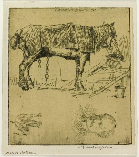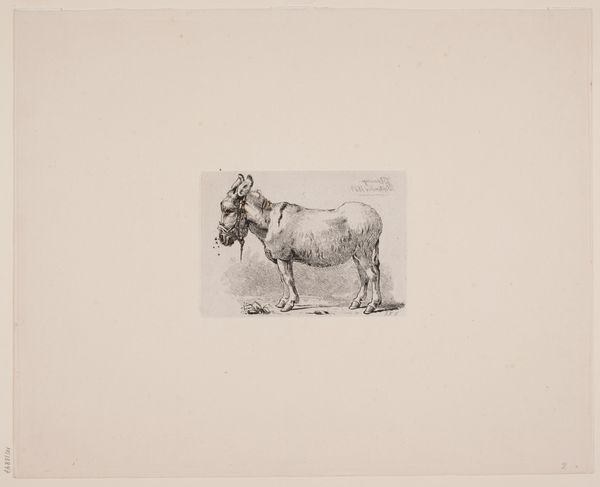 This undated work, "Twee paarden," by Pieter Dupont, is rendered in delicate lines and a muted palette. The subject matter immediately evokes a sense of rustic simplicity. The etching technique brings a textural richness to the surface, emphasizing the muscularity and raw physicality of the horses. The composition, dominated by a large horse and a smaller one tucked beside it, creates a dynamic of scale and proximity that invites questions about dominance and vulnerability. Consider how Dupont uses line to define form, creating a sense of volume and depth. These artistic elements could be seen to destabilize our typical understanding of the pastoral idyll. The drawing suggests themes related to naturalism and the underlying structure of the animal kingdom. The work challenges any fixed ideas about beauty, engaging with new ways of thinking about representation and the animal form. This etching pushes us to reconsider our relationship with the natural world.