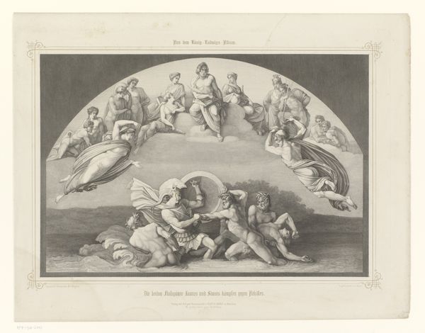 Editor: We're looking at Jacques Nicolas Tardieu’s 1752 engraving, “Allegorie op Spanje,” or Allegory of Spain. The baroque piece, in black and white, features many figures in a semi-circular arrangement. The weaponry and slightly distressed figures suggest some past conflict or battle. What do you see as particularly significant about this allegorical representation? Curator: It's crucial to consider the political climate in which this piece was made. By 1752, Spain’s global power, though still considerable, was on the wane. Allegories like this served to project an image of strength and virtue, masking internal vulnerabilities. What strikes you about the central figure of Spain itself? Editor: I notice she's surrounded by symbols of both war and peace – weaponry at her feet, but also figures making music. It feels like a strategic balancing act. Curator: Exactly. Baroque art often deployed complex symbolism to communicate specific ideological messages. Ask yourself, who was this image intended for, and what message were they meant to receive? The intended audience, typically the elite, would interpret the references to classical mythology, the celebration of military strength, and the promise of prosperity under Spanish rule. How might such imagery have functioned within institutions like royal academies or state-sponsored exhibitions? Editor: It sounds like this engraving is less about pure artistic expression and more about national propaganda, almost like a carefully staged photo-op in print. Curator: Precisely. It makes us consider the role of art not just as an aesthetic object, but as a tool for shaping public opinion and reinforcing power structures. It’s fascinating to see how seemingly neutral artistic conventions are used to legitimize specific political agendas. Has this changed your view on similar works you’ve seen? Editor: It definitely makes me want to look more closely at the context behind art, especially pieces that appear straightforward on the surface. Thanks for your insights! Curator: A pleasure. Analyzing art from a historical perspective opens up entirely new avenues of understanding and appreciation.