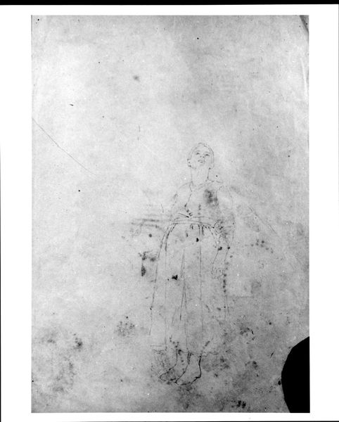 Editor: This is Jean-François Millet's "Standing Figure of a Man Wearing a Smock." It looks like a preliminary sketch. What echoes do you hear in it? Curator: Consider the smock itself, a visual shorthand for the working class. What other symbols can be found? Editor: The outstretched arm, perhaps? It feels like a gesture of offering or supplication. Curator: Precisely. The extended arm is often seen as a beckoning, a welcoming or a plea, which resonates with Millet’s sympathetic portrayal of rural laborers. What do you make of the angle of the face? Editor: Now that you mention it, the face turned slightly away might signify humility or perhaps weariness. Curator: Indeed. Millet used familiar visual language to imbue these figures with dignity and emotional weight. Editor: I see it now, the subtle way the symbols combine. Thanks!