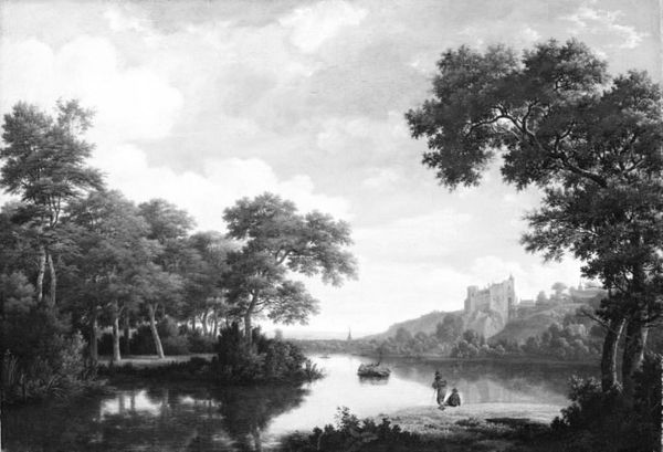 This evocative landscape painting, made by an unknown artist, presents us with travelers amidst classical ruins and a serene river. Note the enduring motif of the fortified city. Here, it stands not just as a structure of defense, but as a powerful symbol of civilization itself. Consider how this very image appears in the medieval tapestries of France, as the 'safe city'; and further back to ancient Mesopotamia where it represented a source of power and divine protection. The river offers both passage and reflection, calling to mind the passage of time and life's cyclical journey. This composition might subconsciously stir feelings of nostalgia and longing, engaging viewers on a deep, almost primordial level. The symbol of the city, like the river, is not static, but constantly reshaped by the currents of time and the tides of human experience.
