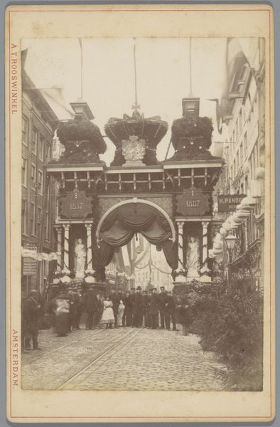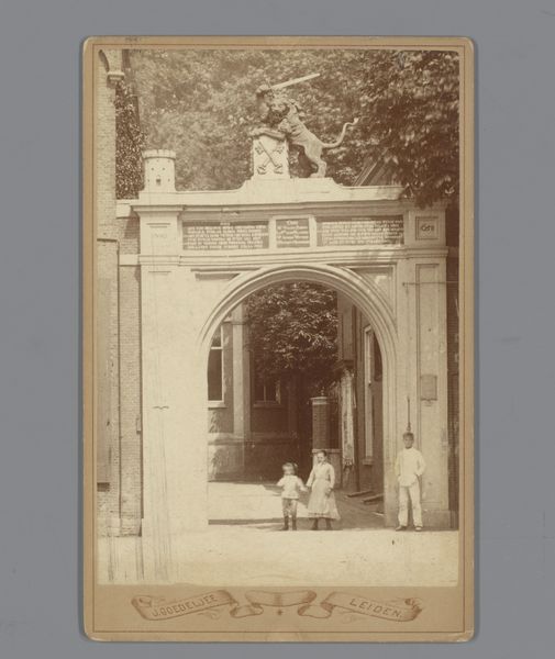 Curator: This gelatin-silver print, created between 1850 and 1900 by Hendrik Jonker, depicts the Doelenpoort in Leiden. Editor: My immediate impression is of a carefully staged photograph, the subdued sepia tones lending it a palpable sense of history and maybe even a sense of foreboding. The imposing gate suggests something of state power, but what sort? Curator: The Doelenpoort, with its military statuary atop, speaks volumes about the militaristic culture and power structures inherent within Dutch society during that period. The figures arrayed before it seem very aware of their roles, reinforcing hierarchical gendered identities. We have soldiers standing guard, seemingly under the authority of gentlemen in suits. It’s hard not to see the portrait's emphasis on patriarchal identity and a tacit support for potential conflicts that arise in protecting its status quo. Editor: The arrangement of the figures—the group in suits to the left, the soldiers gathered within the archway—emphasizes divisions and the importance of order. Considering the material properties of photography, we might ask who possessed the resources to commission such a portrait? It would take specific access to the developing technology, placing power dynamically on both sides of the camera. How complicit or not do the picture's laborers become? Curator: That’s a brilliant point, highlighting the intertwined aspects of class and gender representation at play here. Who gets to be represented in a burgeoning media format, and how, undeniably becomes its own form of social commentary. Considering, too, the stiff poses and controlled expressions; photography at this time could be quite a rigid exercise. Editor: The gate itself—its architecture, those sculptures of military scenes along the top. Even that suggests a narrative carefully constructed by particular artisans under certain economic conditions. What was Leiden known for at that time, materially speaking? How much craftsmanship had the making of war become intertwined in its identity? I notice an inscription along the base of the image with some identifying characteristics about the "Photograaf", further intertwining commerce into the piece. Curator: Examining this work through a feminist lens urges me to question those seemingly inherent associations—militarism, order, and so forth—that were being reinforced through art and visual culture during this era. How could marginalized communities in Leiden react, given what was, or was not available, to them at that time? Editor: Precisely! We need to consider not just the image but also the socio-economic currents running through Leiden during the period, giving it concrete shape. Curator: Thank you for that fascinating breakdown of the economic and material layers inherent within this seemingly simple photographic piece, I believe that adds to our viewing so much! Editor: A pleasure. It helps one appreciate that art is not separate from real life, real circumstances.