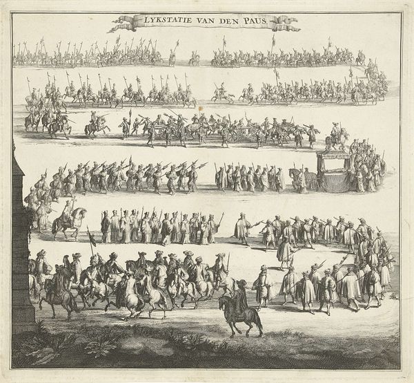 Curator: Well, the first impression this image evokes is almost like… sheet music? There’s this linear rhythm, a steady procession rendered in monochrome. Editor: Indeed. What you are describing is a piece titled, “Begrafenisstoet van Maurits van Hessen-Kassel,” created between 1632 and 1650 by Matthäus Merian I. It's currently held here at the Rijksmuseum, and the technique is engraving, which accounts for the distinct line quality. We are seeing the funeral procession of Maurice of Hesse-Kassel. Curator: So it’s like capturing a grand performance. It makes me think about how rituals solidify memories; the patterns in these displays—clothing, order of passage—transmit social codes and signal identity, not just grief. Does the bird’s eye view play into that, that aerial overview? Editor: Precisely! The vantage point, combined with the stylistic approach that recalls Baroque sensibilities, emphasizes the power and magnificence of the House of Hesse-Kassel. The overhead perspective allows Merian to orchestrate visual details and make specific status pronouncements. Those marching in formation and carefully delineated coaches aren't just individuals but symbols in a language understood by the era. Curator: All this pageantry, designed to endure in image and memory, now reaches us from across time and context. Knowing how memory can be fleeting, unreliable... there’s an intense desire to solidify the cultural memory. Like a collective performance of power and legacy... it strikes me as a particularly fragile declaration against mortality, don't you think? Editor: Mortality and also posterity. I concur; the meticulous details in an engraving also contribute to its sense of lasting permanence. Curator: I wonder what modern day funerary processions will look like rendered as art pieces several centuries hence. I imagine something equally arresting, even with its very different textures, materials, and values. Editor: I imagine so as well. Each age tells its story through symbols. Shall we proceed to the next artwork?