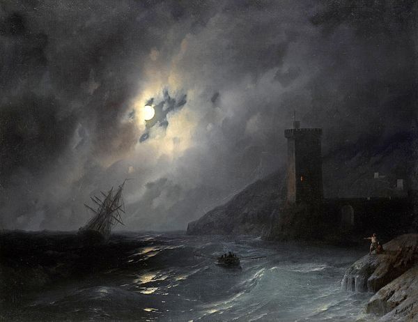 This is "Norwegian coast by moonlight" by Andreas Achenbach. Observe how Achenbach orchestrates a dramatic interplay of light and shadow in this seascape. The moonlight, a key structural element, casts an ethereal glow upon the turbulent waters, creating a stark contrast with the imposing darkness of the cliffs and sky. The composition emphasizes the raw power of nature through its dynamic arrangement of forms. The jagged rocks, rendered with thick impasto, create a tactile sense of ruggedness. These solid forms counterpoint the fluid, almost abstract rendering of the waves. Semiotically, Achenbach employs darkness to evoke mystery and awe. This aligns with the Romantic era’s fascination with the sublime. The structure of the painting is not just representational but also deeply expressive, as the darkness challenges fixed perspectives. Through it, Achenbach captures the sublime intersection of beauty and terror inherent in nature.