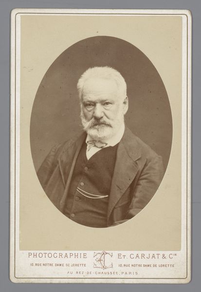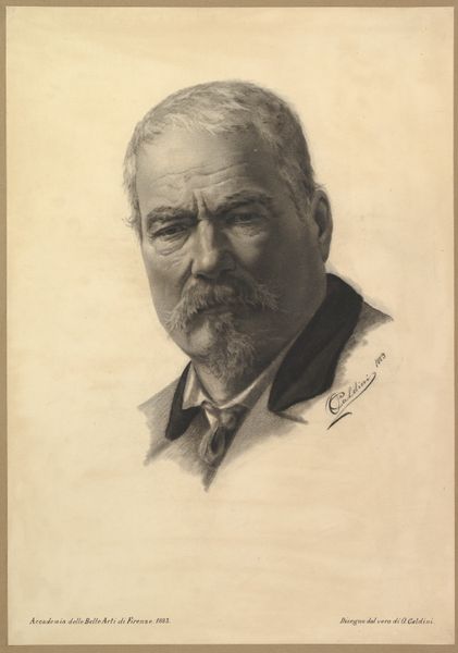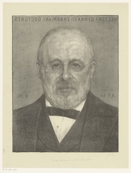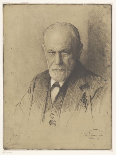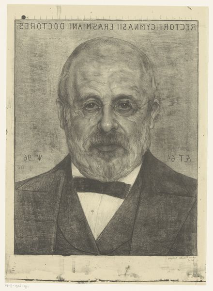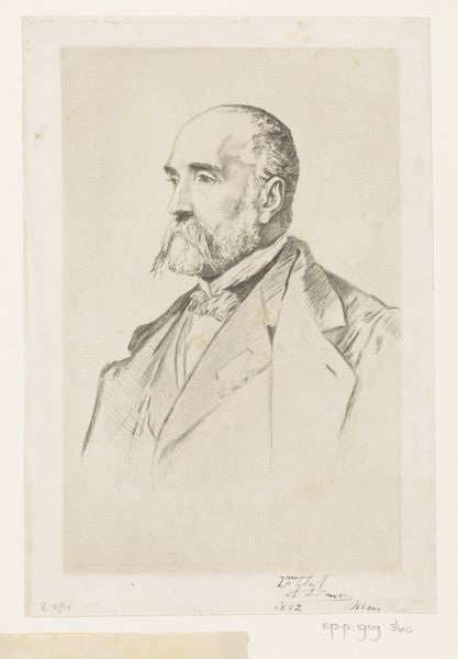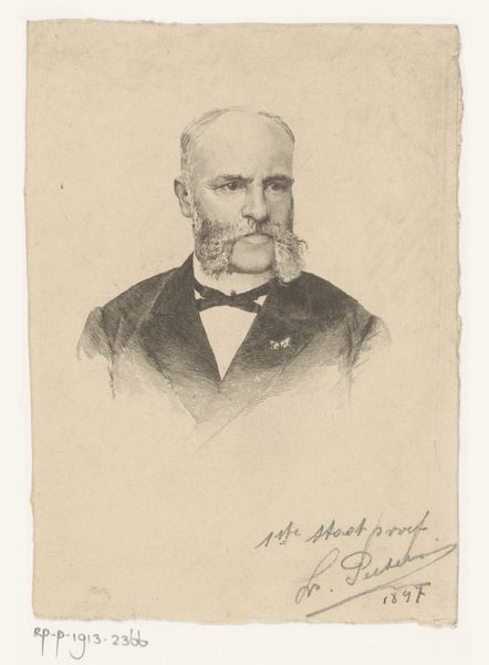 Curator: Today we're observing "Portret van Eudore Pirmez", a realistic portrait completed in 1894. It is the work of Auguste Danse. Editor: I'm immediately struck by the intensity of the subject's gaze. Despite the monochrome palette, his presence feels very strong. And I am curious about the many layers within that look. Curator: Danse skillfully employed engraving here, a type of printmaking, capturing not just a likeness, but the aura of Eudore Pirmez. Notice the etched lines: how they create depth and shadow, animating his features. There's such careful orchestration of light. Editor: Absolutely, the interplay of light and shadow is quite intriguing. And I can detect an array of symbolisms, beginning with his composed features which may reveal him to be quite determined and resolute, typical of a businessman of this period. What's also quite obvious here is a person's sense of duty and civic engagement in society. It's as if the gaze is constantly locked and ready to embrace future challenges, suggesting someone constantly looking into tomorrow. Curator: You mention his role, and the bow tie and suit speak to a certain social standing, a respectability he wished to project. It almost serves as a visual shorthand. But to go back to my earlier thought, it makes sense for Danse to have completed this portrait, because, as you pointed out earlier, his etching is able to communicate a whole network of emotional meaning within each etched line. Editor: Yes, exactly! And even now it reminds us of the stories they tell without saying a word. Perhaps through realism, we discover timeless values—those shared hopes, the echoes of purpose that connect then and now. Curator: A captivating experience to consider the cultural underpinnings here. Editor: Indeed, and by slowing down to look closely, we reveal all that we were meant to see.