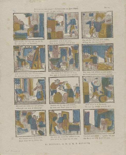 Editor: This piece, "Gij, lieve kind'ren kunt uit Duimpjes voorbeeld leeren, Dat moed en overleg 't gevaar kan overheeren" created between 1806 and 1830 by Joseph Zender, employs engraving and etching in its printmaking. It’s got this storybook quality, laid out in little scenes. What strikes you about this work? Curator: It's interesting to see the deployment of printmaking techniques, particularly etching and engraving, to disseminate a popular narrative. Think about the accessibility of this medium – it's reproducible, relatively inexpensive. What does that say about the intended audience and the social function of art at that time? This print challenges the high art/low art binary. It speaks to craft, labor, and the production process. Who was consuming this, and how might its message have been received, do you think? Editor: I imagine this was pretty widespread among households, maybe as an educational tool, which makes me consider the labor involved. How does its reproducibility influence your interpretation, versus, say, a singular painting meant for an elite patron? Curator: Precisely. This isn't about unique artistic genius in the traditional sense, it is not about the unique master's touch. Instead, it draws our attention to the mechanics of production. The act of reproducing the images, the workshop, the potential for collaborative labor – these aspects become central to the artwork’s meaning. Consider Zender's role as a bookseller ("Boekhandelaar") as integral to understanding his material practice and broader circulation of his moralizing narrative art. Editor: So, focusing on the method brings into light social themes of art at that time. I never thought to see it like that. Thanks! Curator: Indeed. Paying attention to the means and social contexts through which art emerges enables us to ask questions that exceed the purely aesthetic experience and to have a greater, deeper cultural understanding of an artwork.