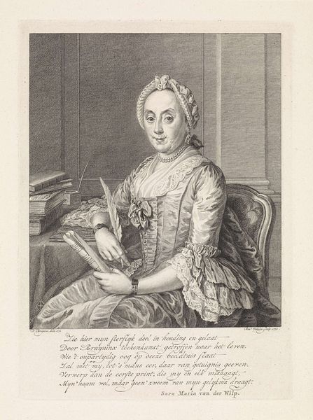 Curator: I'm drawn to the directness in this piece; it's so elegantly composed. Reinier Vinkeles crafted this engraving, a portrait of Lucretia Wilhelmina van Merken, in 1792. Editor: It's an intriguing portrait, no doubt. There's a quiet intensity about it that I wasn't expecting. I see a mind at work here, doesn’t it strike you as remarkably astute? Curator: Absolutely, and I think the neoclassicist style really enhances that sense of poised intelligence. Note how the light catches the paper she's writing on, the very symbol of her work as a poet and playwright. Vinkeles is spotlighting not just her likeness, but her intellectual engagement. Editor: You can clearly see the fine line work. Vinkeles’ mastery really stands out when you look at the delicate details of her lace cap, and then compare it with the heavier rendering used for the curtain in the background, giving such an elegant sense of depth. It really emphasizes the contrast between background and subject. Curator: I agree completely. It is all beautifully rendered, that intricate line work really elevates this piece, imbuing it with such character. One can’t help but wonder about the historical context of powerful, intellectual women claiming space in what had long been male-dominated disciplines. It’s a story about taking center stage! Editor: True. It’s a moment captured; an author in her study, a gentle strength radiates outward—the soft curve of her hands, the set of her gaze... she knows her worth, doesn’t she? I do wonder about the dynamic between Vinkeles, the artist, and van Merken, the subject, as both must have needed the other to fully solidify their reputation. Curator: Yes! An intriguing dialogue is set up within this piece and one we still seem to be debating over 200 years later! Editor: And that's what keeps it alive for each new pair of eyes, isn’t it? What stories we choose to tell ourselves about this quiet moment.