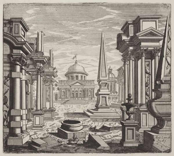 Editor: So, this print, "Fantastic Townscape with Ruins" by Giuseppe Antonio Landi, was made before 1753. It's incredibly detailed, almost dreamlike with all these crumbling structures. It feels like a commentary on the impermanence of things, you know? What do you see in this piece? Curator: It's interesting you pick up on impermanence. These "fantastic townscapes," especially popular in the 18th century, reflect a real fascination—even an anxiety—around the cyclical nature of power and civilization. These ruins aren't just pretty backdrops. They served as potent symbols. Editor: Symbols of what exactly? The fall of Rome? Curator: Potentially. Think more broadly. The ruins invite viewers to contemplate the rise and fall of empires and question contemporary society's trajectory. These images gain popularity with increased colonial activity across the globe. How might such an image function ideologically at that moment? Editor: That's fascinating! So, it’s not just a beautiful scene, but also a prompt for political and social reflection. Colonial powers displaying scenes of destruction… to reflect on its own impact and impermanence? Or maybe the futility of rebellion against it? Curator: Precisely! And consider how the artist chooses to depict them. Are they romanticized? Glorified? Or is there a sense of loss and decay? Landi's composition is meticulously constructed, guiding the viewer's eye to create a specific narrative and ideological reading of these "ruins." Editor: This makes me see it completely differently. I initially saw just decay, but now I see an intentional narrative about power dynamics. It's pretty incredible how much history can be embedded in an image like this. Curator: Exactly! These townscapes were made to do far more than beautify a wall. The politics of imagery, the power that art possesses! They remind us that the art and the institutions showing the art—they always leave their traces.