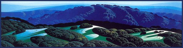 Editor: Here we have Eyvind Earle's "Two Emerald Jewels" from 1998, a painting that renders a landscape almost as a geometric puzzle. The dark greens are really intense. What elements of the artwork catch your eye and how do you interpret them? Curator: Initially, it's the formal interplay of light and shadow that demands attention. Notice how the sharply defined shapes are deployed, dividing the canvas into distinct planes. This fragmentation serves not to disrupt, but to underscore a sense of depth. The jewel-toned greens suggest an artificially constructed space—almost like a carefully manicured garden rather than untouched wilderness. Editor: So, you're saying the artifice is part of the point? I guess it does feel very controlled. Do the individual elements like the tiny figures have a part in this too? Curator: Precisely. Consider those minute figures placed strategically in the brightly lit clearing. Their scale serves to amplify the immensity and stylized character of the surrounding landscape. They are integrated into the composition in order to serve its geometric integrity. There is almost a tension created through how we perceive scale. Editor: I hadn't thought about how their size contributed to the overall feeling. This has definitely opened up my understanding. Thank you. Curator: My pleasure. Close visual analysis can open paths of comprehension.